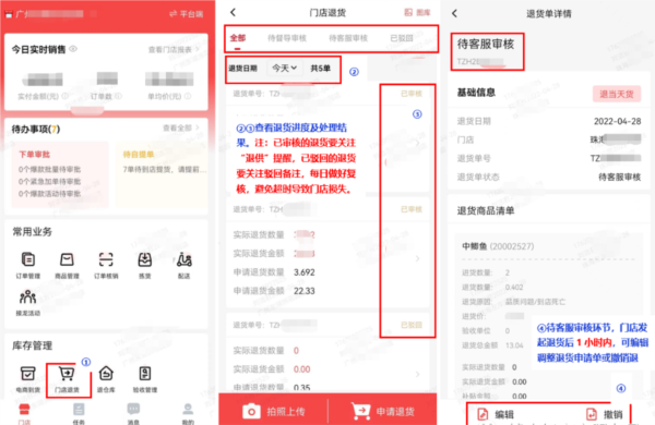 (3)提交退货申请后,门店可通过【库存管理-门店退货】页面跟踪处理进度与结果。当前状态分为待督导审核、待客服审核、已驳回、已审核、已撤销五种。门店需特别留意“退货驳回备注”及“审核后实物退供提醒”,避免因未及时查看或操作而造成损失。页面示意如下: