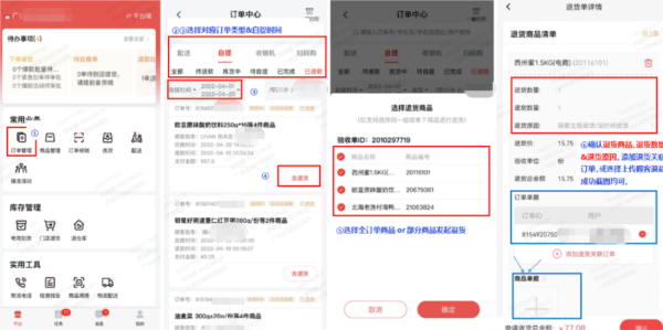 (2)关于门店线上商品退货,还有一种按顾客退款订单维度操作的指引。门店通过助手【常用业务-订单管理】页面,选定对应订单类型及自提时间,找到已退款的订单后,可直接对该订单的全部或部分商品发起退货。具体如下图所示: