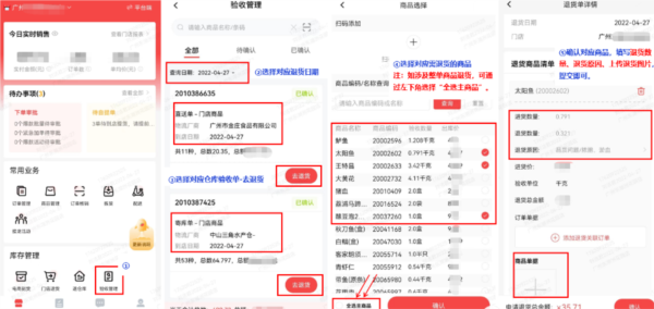 (1)针对门店线下与线上商品的退货,门店可登录助手APP,进入【库存管理-验收管理】页面发起申请。操作前需选择商品到店日期,再依据对应仓位的验收单点击“去退货”。
