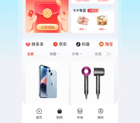 3、购物中心:进入购物页面,挑选来自多个主流电商平台的精选商品;