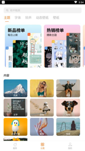 4、点击分类,可以分类查看,除了主题外,还有字体,铃声,动态壁纸等资源。