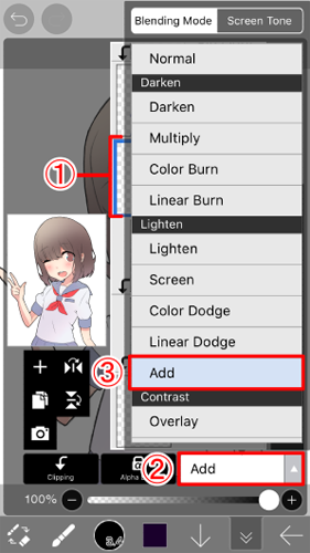 点击图层1使新建的图层成为当前操作层,接着点击“添加”打开混合模式菜单,在第三步中选择“添加”混合模式。