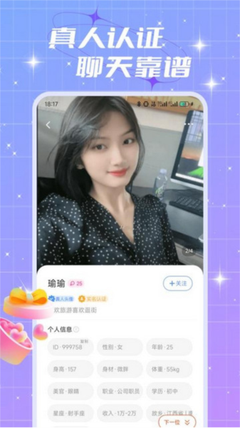 真实高效:实行实名、真人及视频认证,点击头像即可查看对方真实信息,一键开启语音视频聊天;