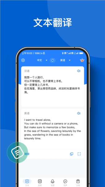 -文本翻译:输入文字,一键完成翻译,过程简单直观。