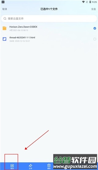 5、长按选中需要下载的文件,点击“取回”按钮。