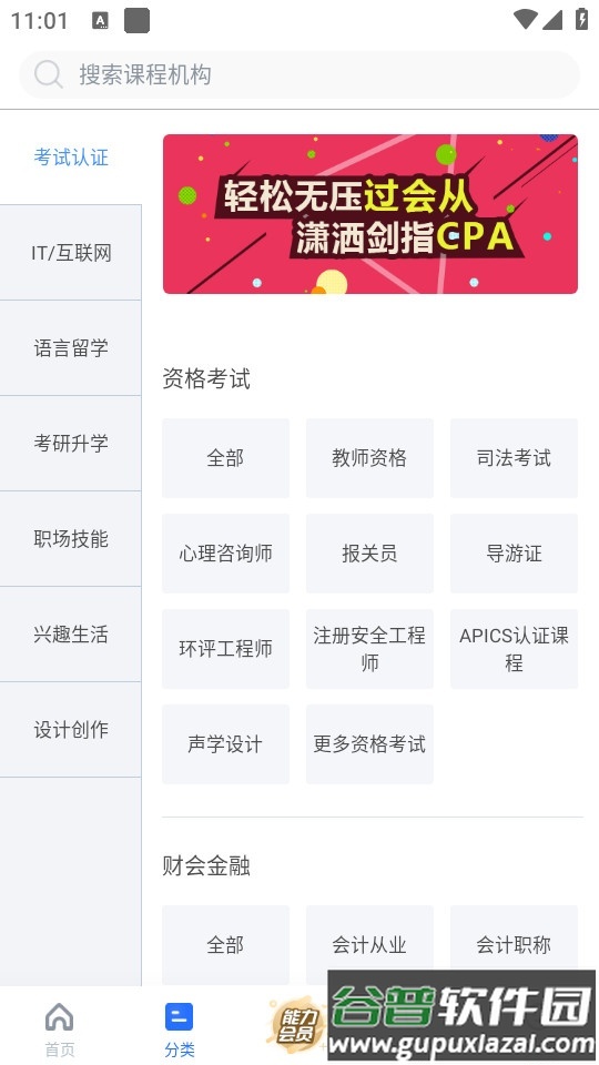 课程包含众多行业,司法、注册会计师、教师资格、医药、建造等类别齐全,同时为职场新人提供实用指导。
