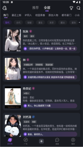 【技术和艺术融合】虚拟角色类型丰富且各具特点,无论你钟情何种风格,都能在此发现心仪之选;他们由AI技术与人工创作共同塑造,确保每个细节都贴近你的想象。