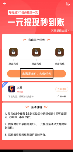 2. 点击去做任务按钮,按要求完成三个指定任务,完成后即可领取1元奖励。