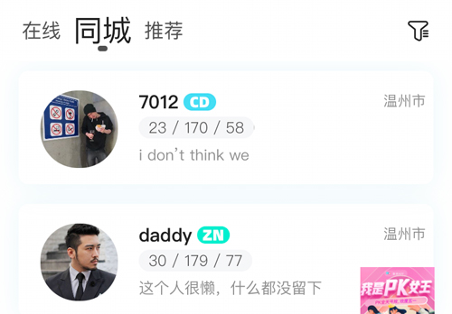 打开应用,点击底部“交友”栏目,在中部可见“在线”、“同城”、“推荐”选项;点击“同城”,页面将展示所有与你同城的用户。