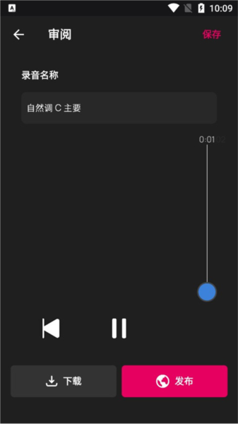 点击主界面中央的粉色加号“+”按钮,即可进入录音室。点击红色圆形按钮开始录音,再次点击同一按钮结束录制。