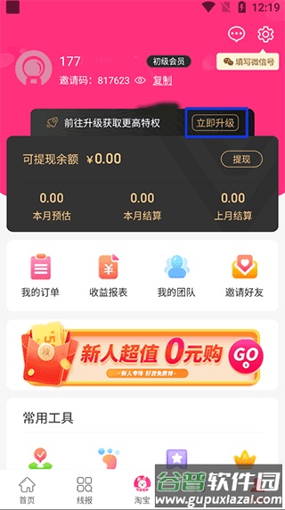 1、进入软件后,在个人页面找到蓝色区域的“立即升级”按钮并点击;