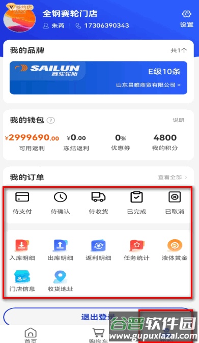 3、个人中心页面集中呈现品牌资料、钱包返利详情以及各类入库出库记录。