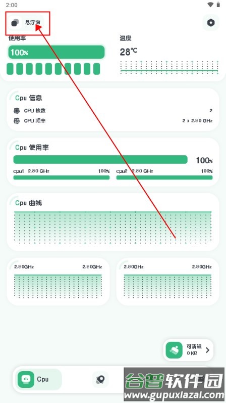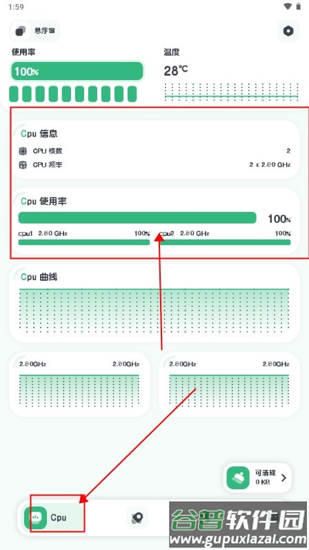 1. 打开软件后,主界面会显示手机当前运行状态,包括CPU信息与使用率。