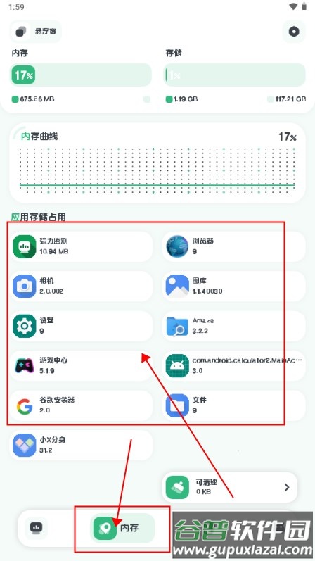 2. 切换到内存页面,可以查看应用储存空间的占用情况。
