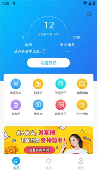 1. 下载安装后打开应用,首页提供录取预测、排名查询、政策资讯等功能入口。