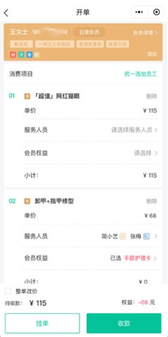 3、查看并管理会员各项权益,在收银时智能应用相关优惠;