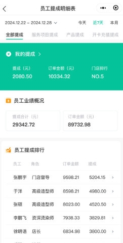 【店员提成与管理】:具备员工信息、权限分配与服务日志等基础管理功能;系统支持统一设置提成规则,在开单或办卡时指定服务人员,即可自动核算业绩与提成,简化管理流程;