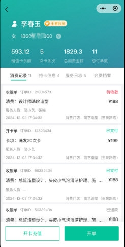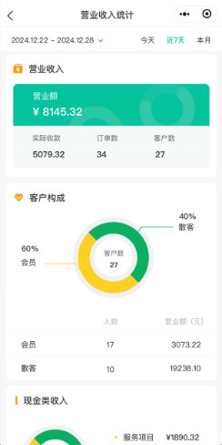 【高效开单收银】:顾客建档、登录、办卡与消费等操作流程简洁连贯;支持多种卡类,可灵活配置充值赠送礼金、次数或折扣,优惠力度安全可控,兼顾灵活与规范;