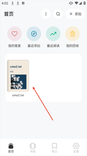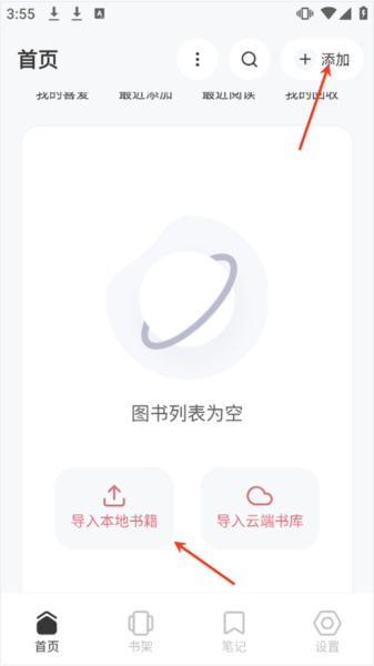 2、导入书籍时可以点击右上角的添加按钮,首次使用时首页中央区域会出现导入本地书籍按钮点击即可