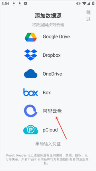 1、登录Koodo Reader app后可以选择添加云盘数据源,不添加可以直接跳过