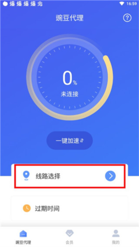 1、若当前IP不理想需要更换,可打开app,在首页点击【线路选择】。