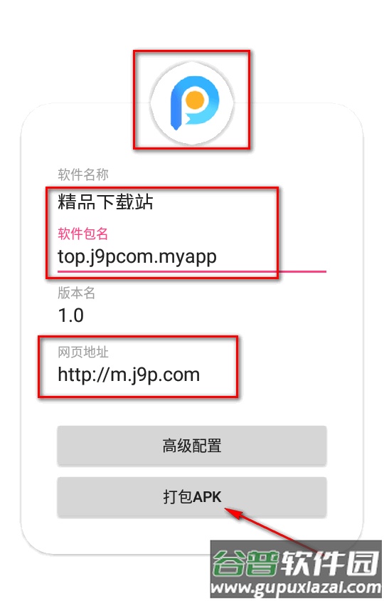 3、在页面内设置好应用图标、名称、包名、版本号以及目标网页地址,然后点击打包apk按钮。
