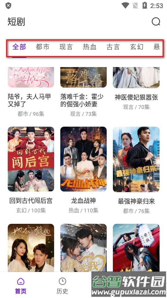 3、首页划分了清晰的分类板块,包括都市、现代言情、热血、古代言情、玄幻、悬疑、其他剧情、动作、历史与喜剧等。