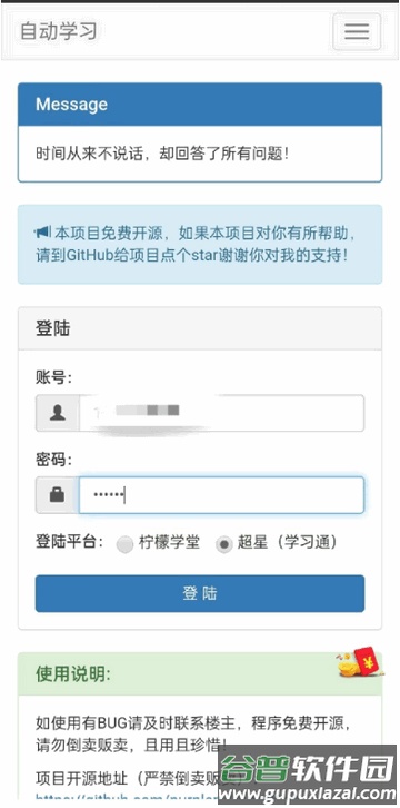 这款免费开源的自动化学习工具能够帮助用户便捷完成柠檬学堂与超星学习通上的课程任务。只需打开应用并输入账号密码即可登录使用,整个过程简单快捷。软件完全免费开放,旨在为学习测试提供便利,请勿将其用于任何违规场景。