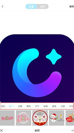 2、在底部功能栏中选择水印选项,内有我的、热门、位置等多种水印分类;