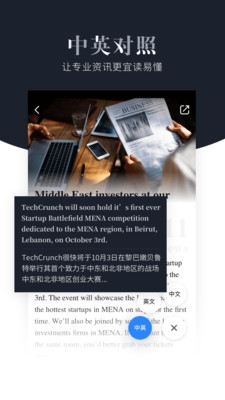 4、专注于海外优质财经与科技资讯的聚合,通过全自动标题摘要汉化、阅读时的即时词典等功能,让专业信息的获取更加直观易懂。