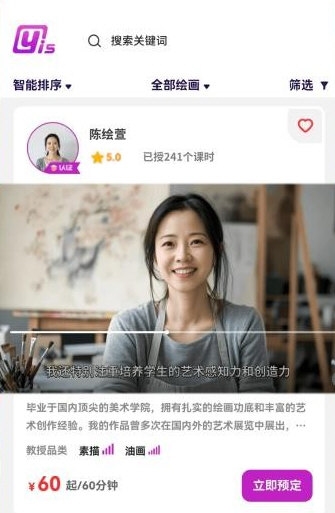 面对丰富的艺术品类与众多经验丰富的老师,Yis提供大量课程与教师资源,助您快速体验并找到心仪的艺术方向。课程与教师信息透明,具备实名认证与作品展示,让选择更踏实。