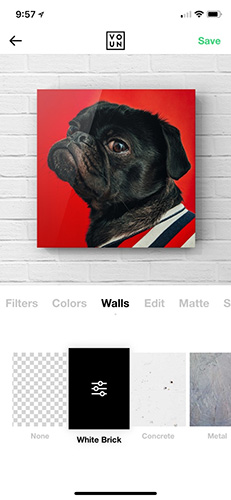 2、在编辑界面可自由选择画框样式、滤镜效果以及背景纹理;背景模拟了砖墙、金属板、旧墙面等多种材质,营造出真实的陈列氛围;根据需求调整各项参数后,导出保存即可;