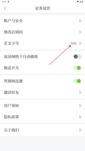 3、在设置菜单中,点击【正文字号】选项。