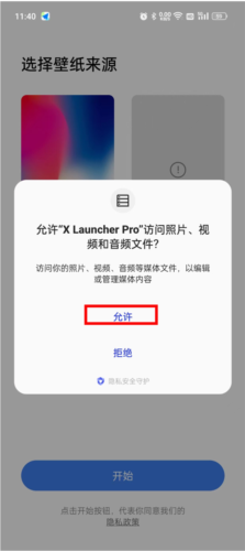 2、权限授予完成后,选择壁纸来源;建议选用系统推荐选项,点击底部开始按钮进入桌面。