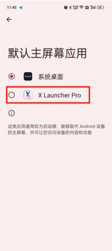 6、系统将跳转至默认主屏幕应用选择页面;选择第二个“x launcher pro”,点击确定即可完成设置。