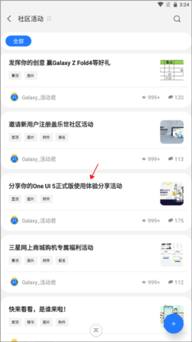 2、此处会展示软件推出的各类活动,例如三星某个系列产品的使用测评,选择你想参与的活动。