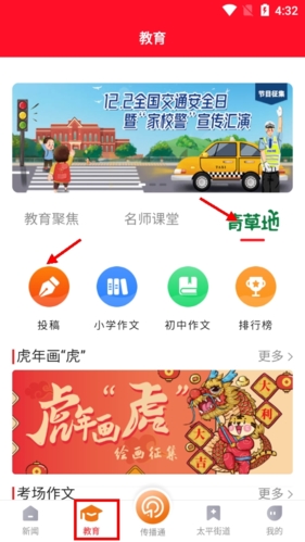 1、点击底部“教育”栏目,进入后找到“青草地”专区,点击“投稿”按钮。