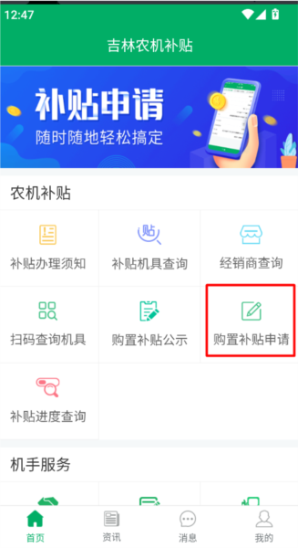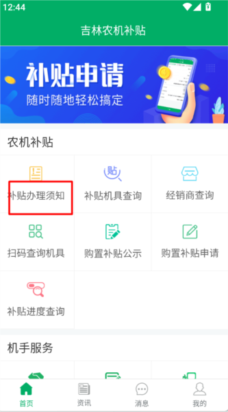 1、打开并登录吉林农机补贴app,在首页找到并点击“补贴办理须知”,仔细阅读相关的政策说明与申报条件。