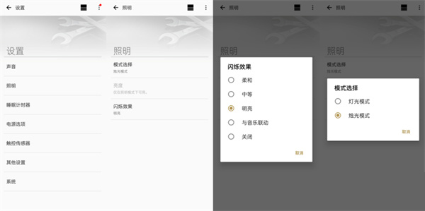 在应用端可以直观地对音箱和灯光进行设置,灯光设置界面提供了多种灯光效果调节选项。