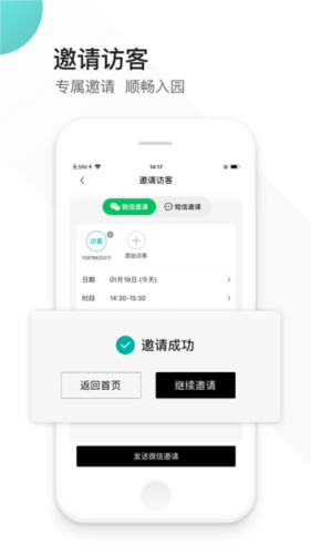 访客邀约可通过微信或短信快速完成,并生成专属VIP邀请函;