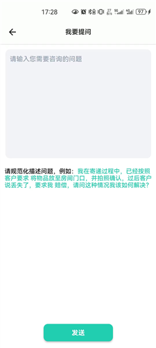 进入在线咨询界面后,点击下方我要提问按钮,输入需要咨询的具体问题。
