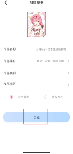 3. 进入创建新书页面,填写作品基本信息后确认完成;