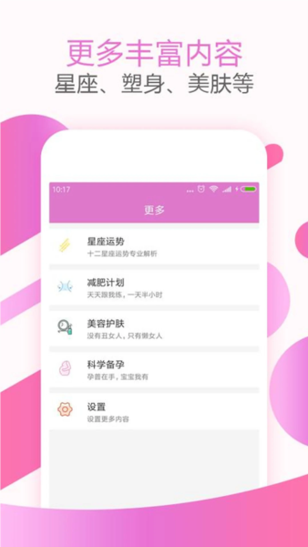 备孕板块提供快速怀孕指导、孕期饮食禁忌与辅食制作方法;月经板块解答日期记忆、经期饮食与卫生用品选择疑问;心理辅导内容帮助释放压力与缓解焦虑;妇科知识解析痛经原因、妇科疾病与受孕问题;新用户可领取专属礼包;社区内聚集了减肥、美容、美妆与购物等女性感兴趣的话题。