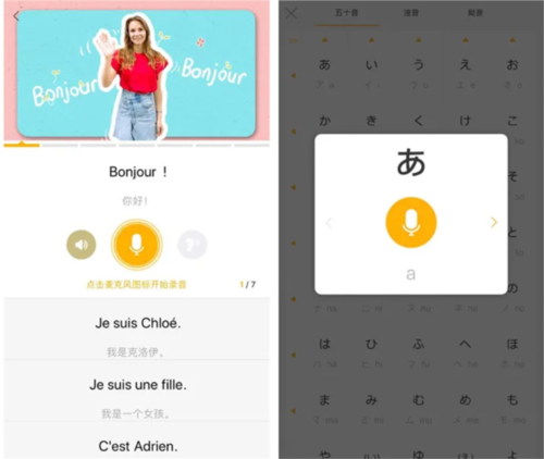 针对日语和韩语,额外提供字母闯关与发音表跟读练习,辅助记忆五十音与韩语字母。