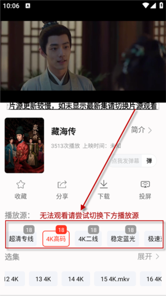 2. 在线播放:支持多种影视类型的在线播放,提供超清、4K高码、蓝光等多种画质选项;若当前线路无法播放,可切换其他来源。播放界面支持发送弹幕、收藏、分享及下载等操作。
