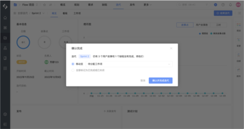 在迭代列表中打开需结束的迭代概览,点击“结束迭代”按钮。系统将提示处理未完成的工作项,可选择将其移至未分配列表、分配至下个迭代,或全部标记为完成/关闭状态。