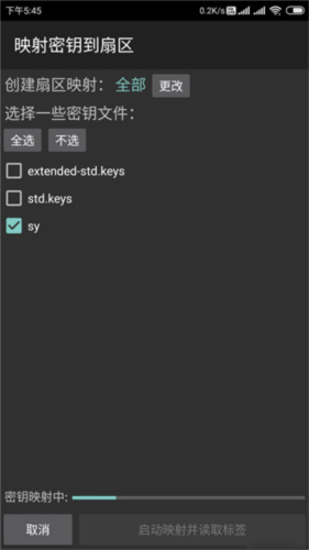 2、在主界面点击“读标签”,勾选密钥文件后,将原卡贴近感应区,点击“启动映射并读取标签”;