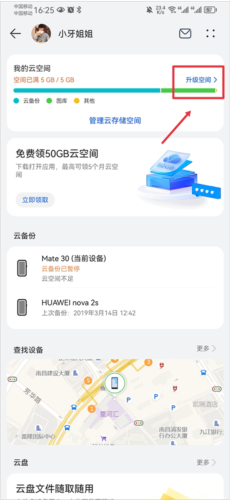 1、在华为云空间应用中点击“升级云空间”。