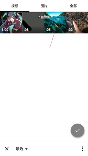 2、点击新建视频,在素材选择界面中,勾选第一个视频片段,点击右下角确认按钮。