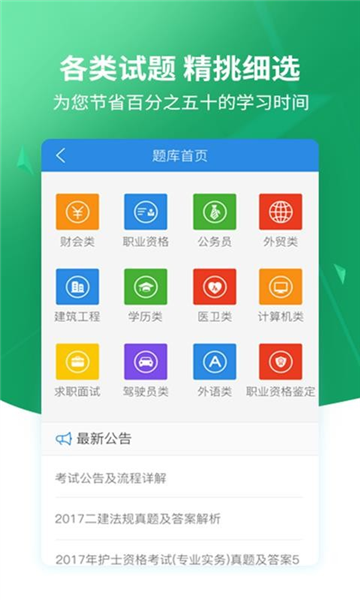 4、进入题库中心,按需选择不同类别题库进行练习,并查看相关考试公告;